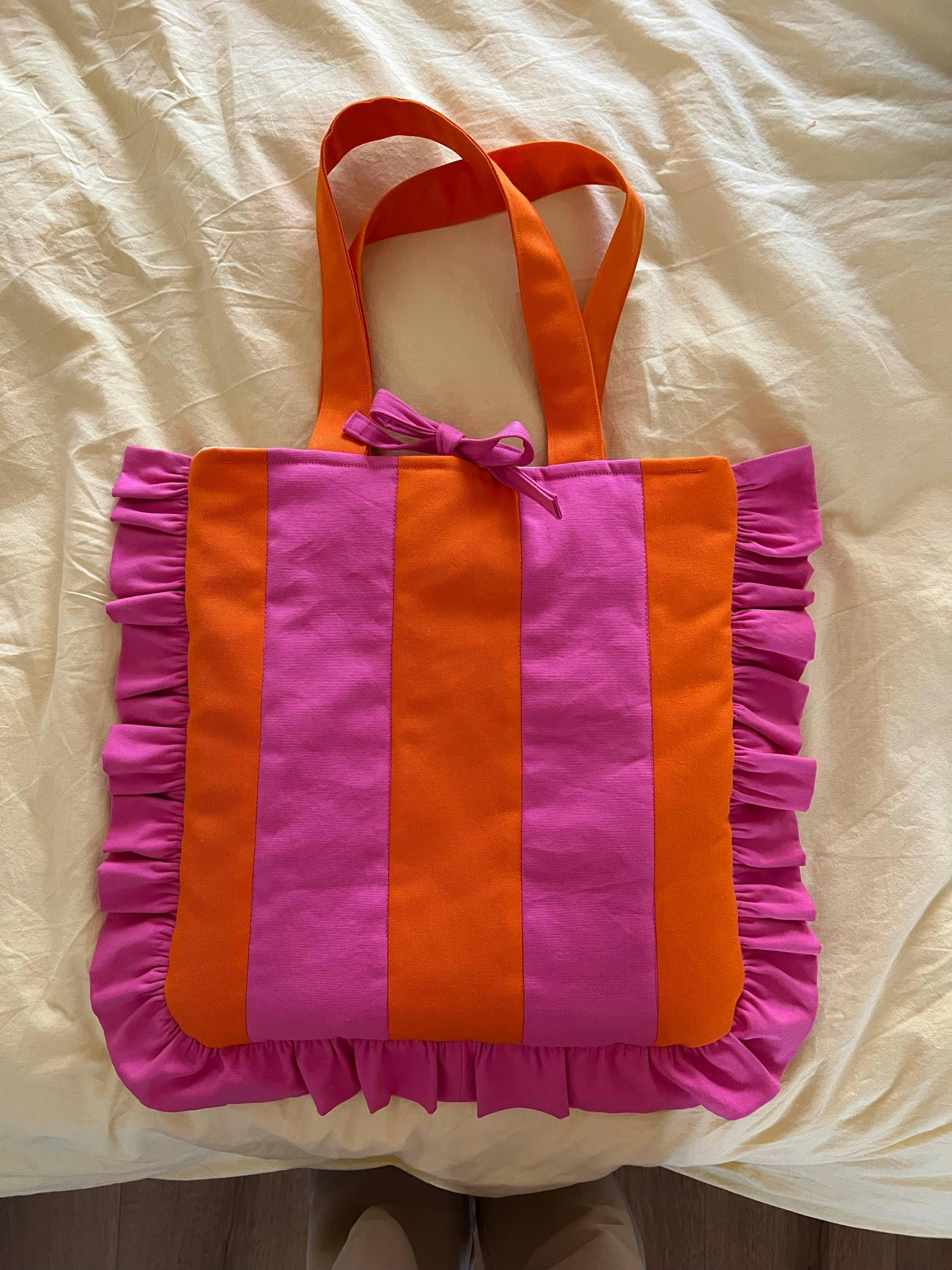Sew your own trendy ruffled tote bag with bow tie closure and an internal pocket! This super cute and spacious tote bag is the perfect beach bag, you can fit everything and a bit more!